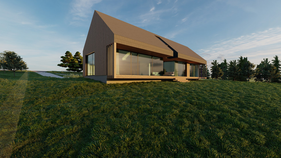 Žemės sklypas su nuolydžiu orientuotas į pietų ir ežero pusę diktavo namo funkcinį ir tūrinį sprendimą. Pietinėje pusėje įrengti vitrininiai langai, tarp svetainės ir miegamojo suprojektuota įgilinta terasa, tad terasoje galima ilsėtis ir lietingą ir vėjuotą dieną.